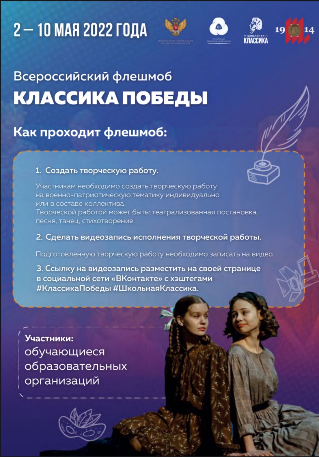 Департамент государственной политики в сфере воспитания, дополнительного образования и детского отдыха Минпросвещения России информирует о проведении со 2 по 10 мая 2022 г. Всероссийского онлайн-флешмоба «Классика Победы», который реализуется в рамках Всероссийского проекта «Школьная классика».