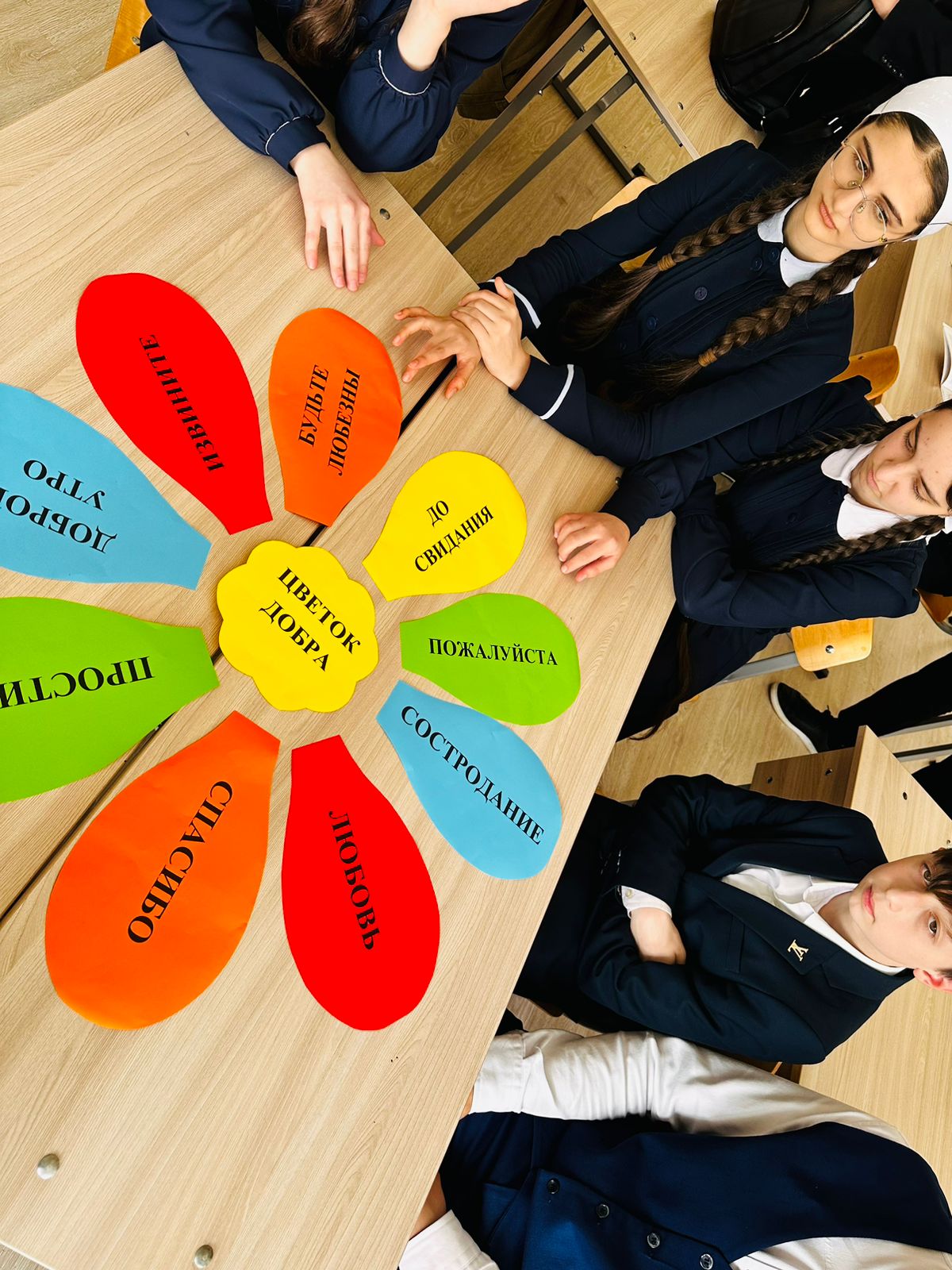 Активисты МБОУ «СОШ №1 с.Закан-Юрт им. Д.И.Акаева» провели очередную небольшую акцию в копилку добрых дел! Для этого они создали цветок добра и описали на каждом листочке вежливость!