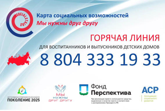 26.09.2017Карта социальных возможностей - это масштабный, федеральный проект для воспитанников и выпускников детских домов. Проект реализует Центр молодежных и предпринимательских инициатив "ПОКОЛЕНИЕ 2025 при поддержке АНО "Мы нужны друг другу".